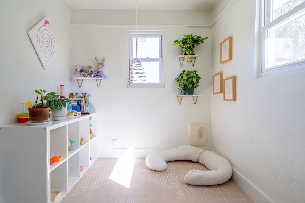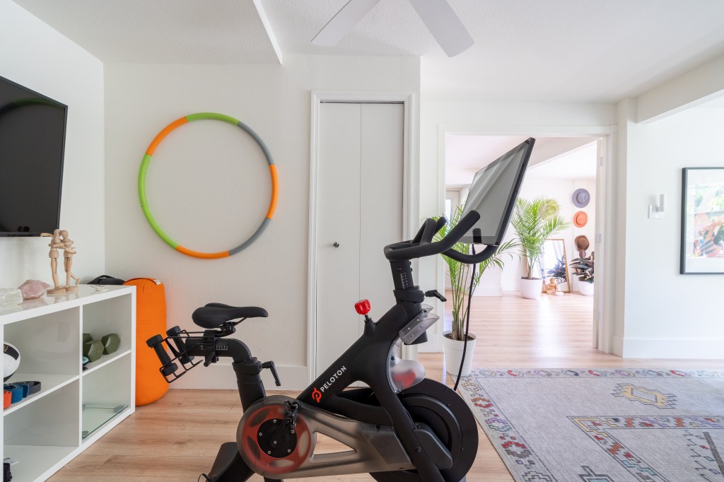 This property has three bedrooms, two bathrooms, one kitchen on each floor, and one room at the entrance, where we created a co-working and exercise area.